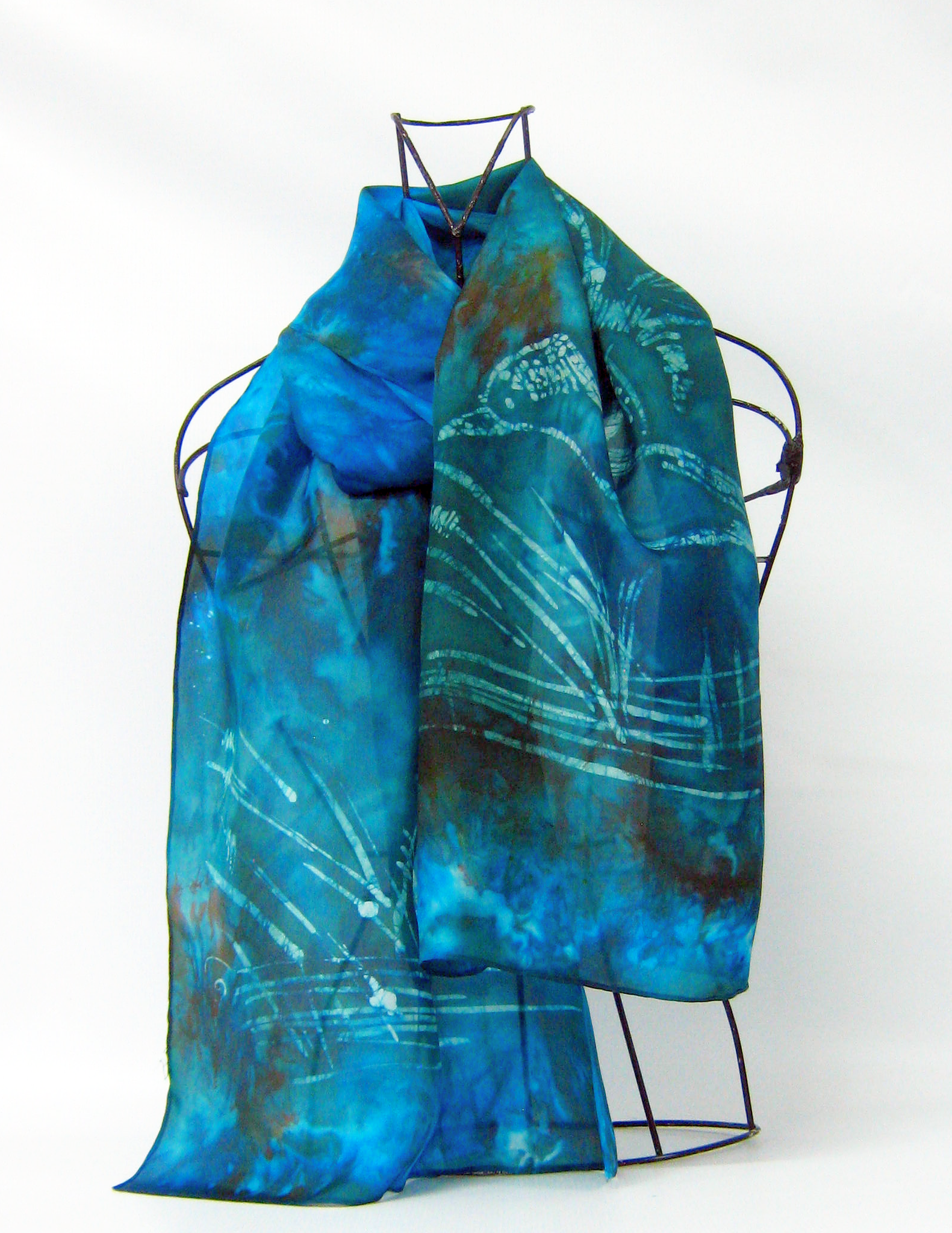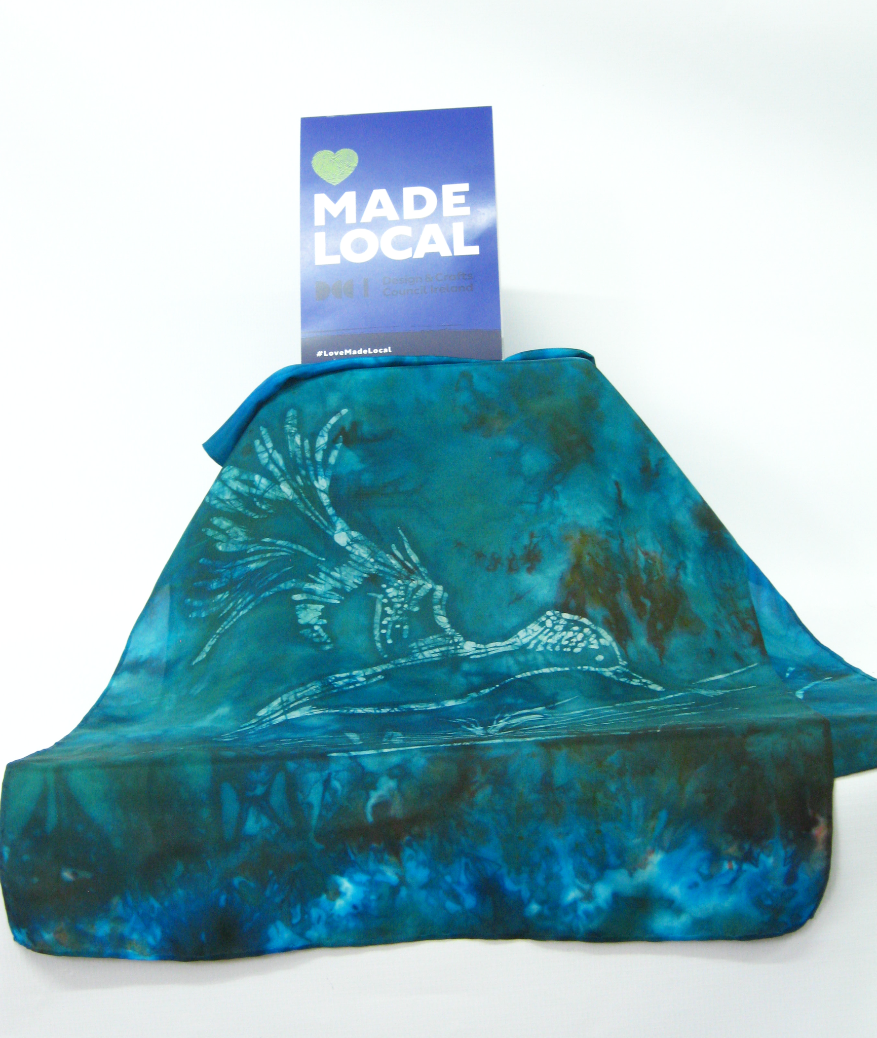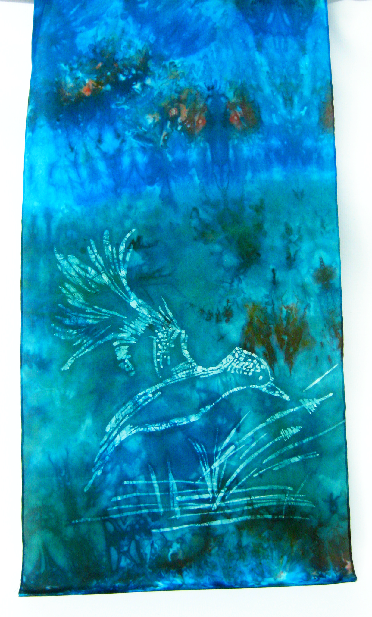 This silk scarf is hand painted in Ireland by Louise Loughman a delicate wax sketch of the Kingfisher in shades of dark teal green with bright turquoise with shades of chestnut.