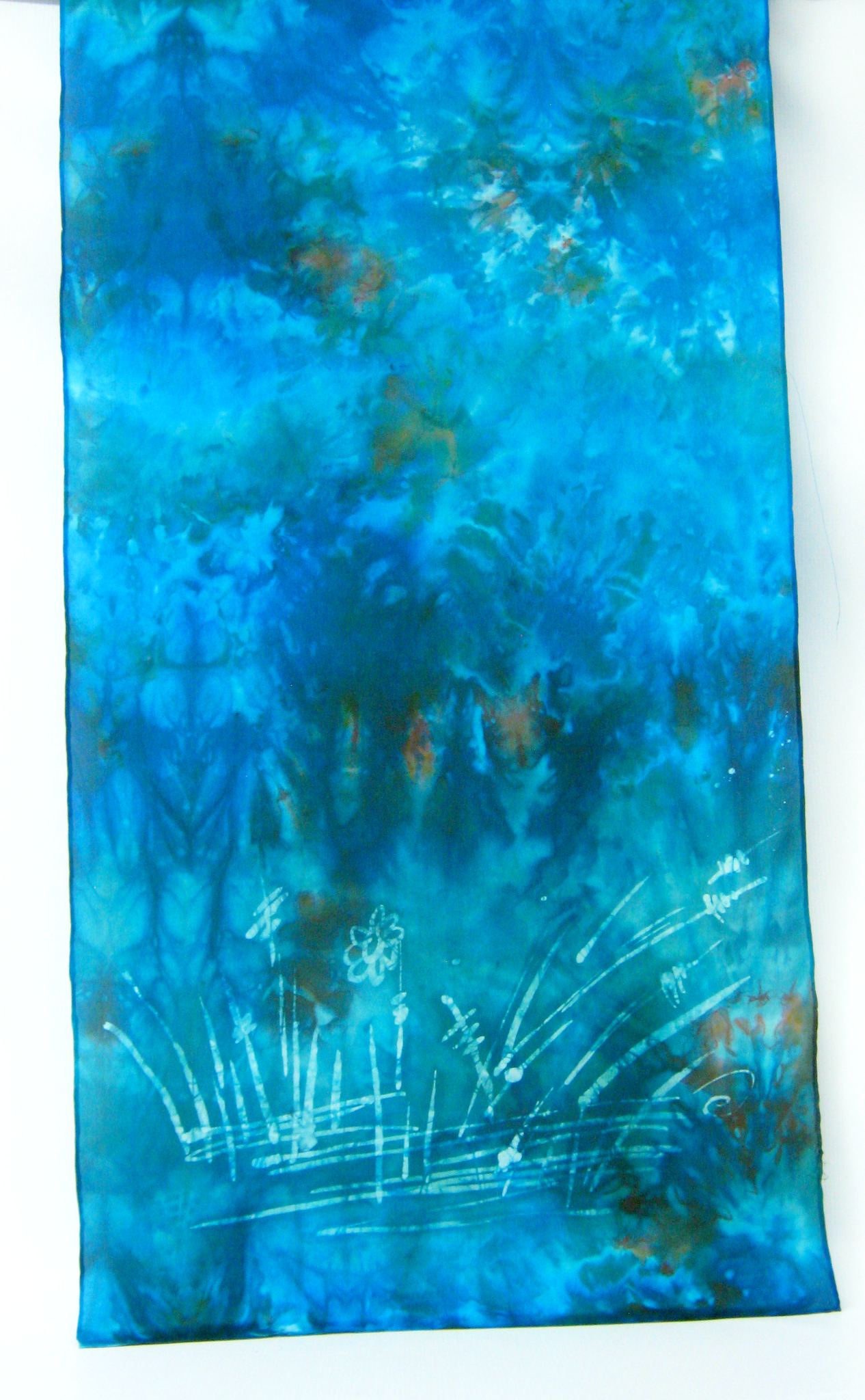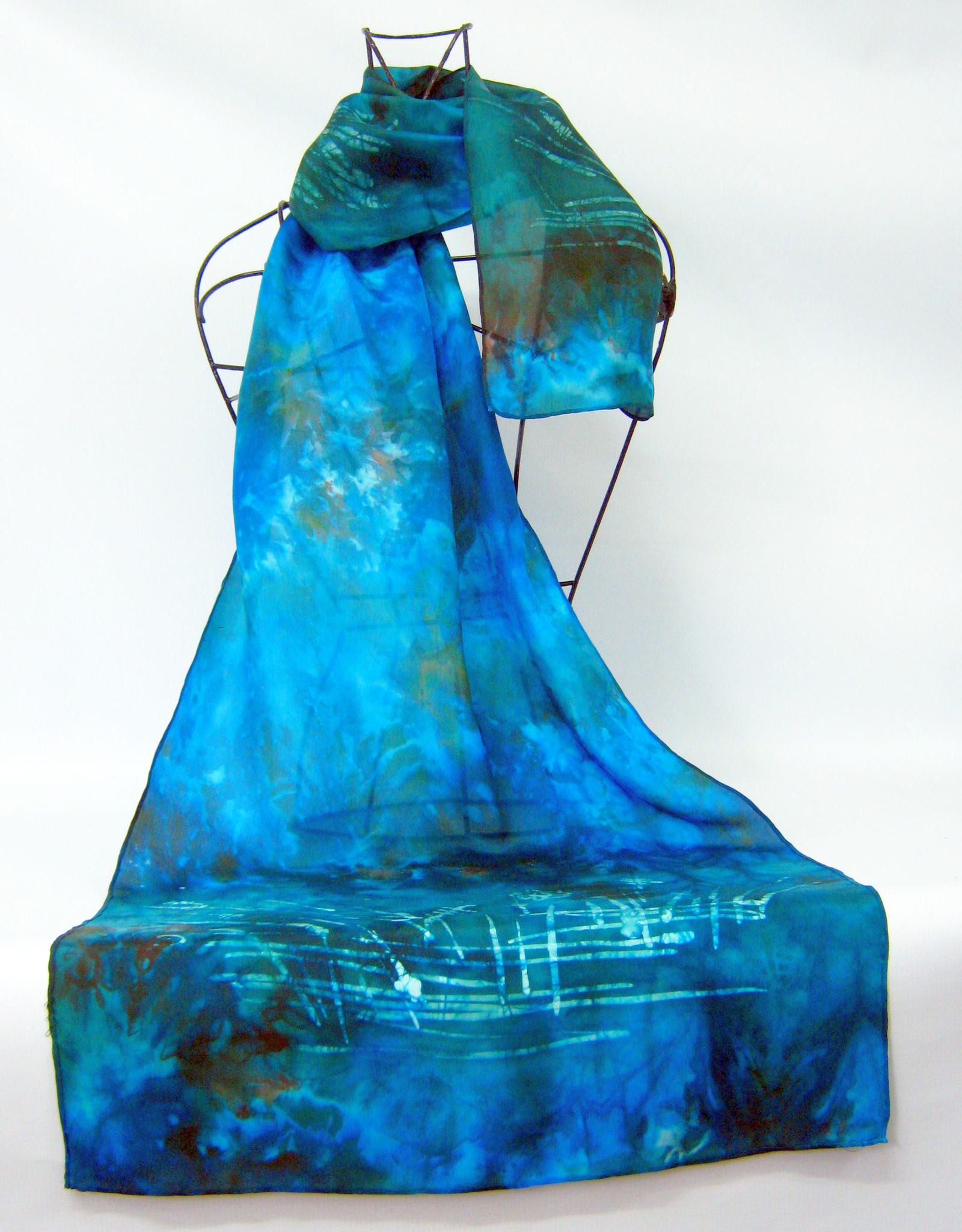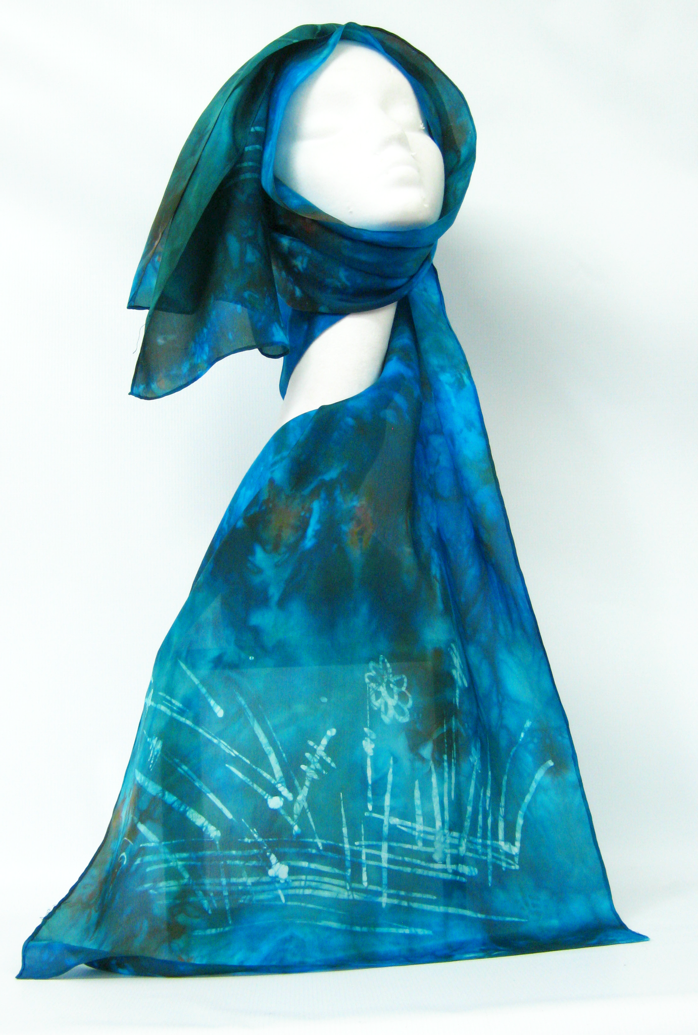 This silk scarf is hand painted in Ireland by Louise Loughman a delicate wax sketch of the Kingfisher in shades of dark teal green with bright turquoise with shades of chestnut.