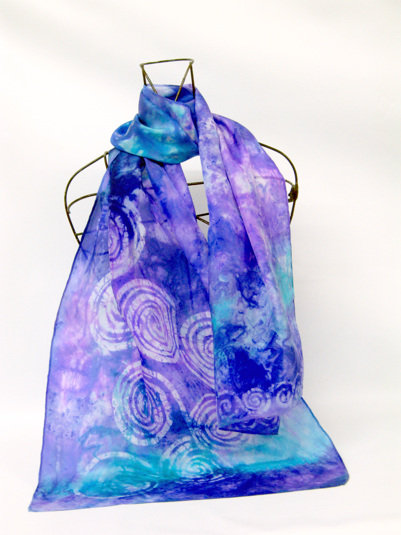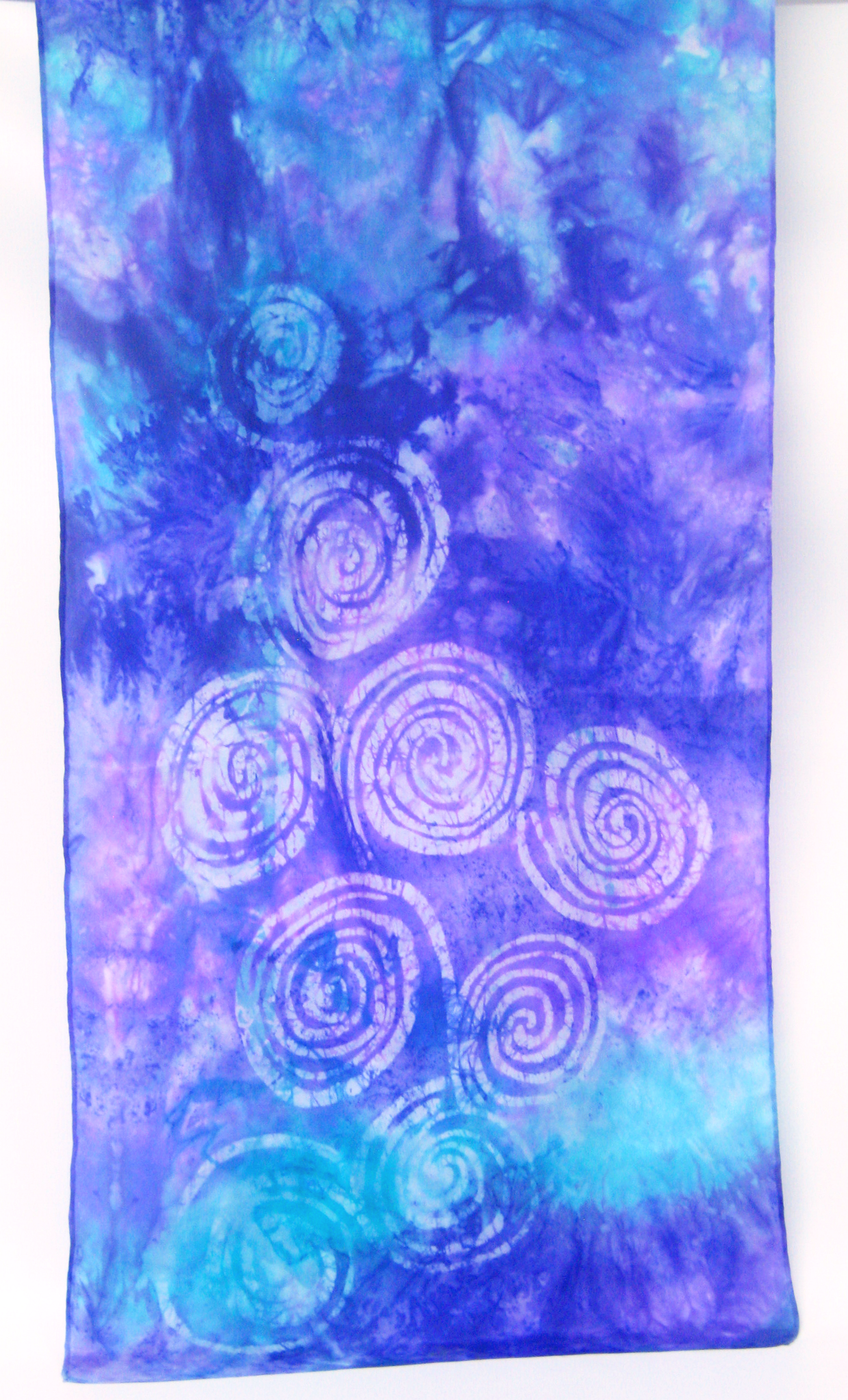 This hand painted silk scarf is done by Louise in the art of batik