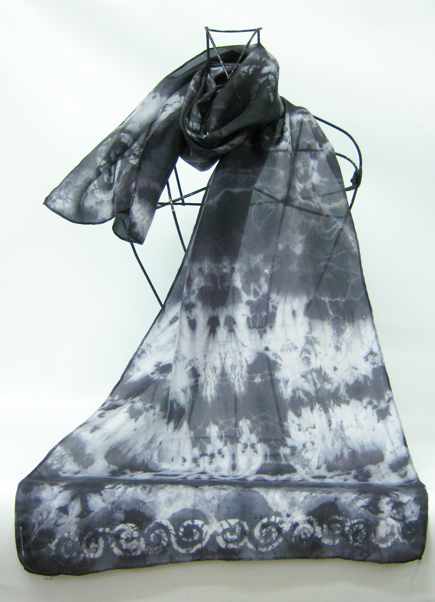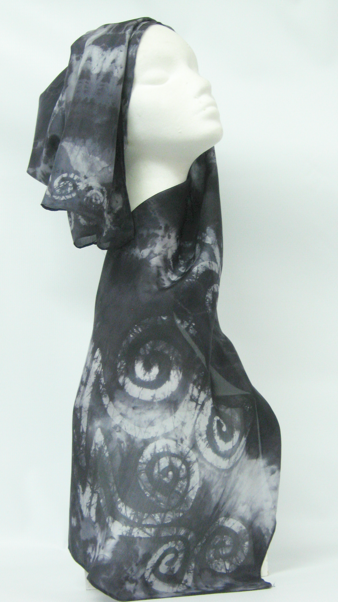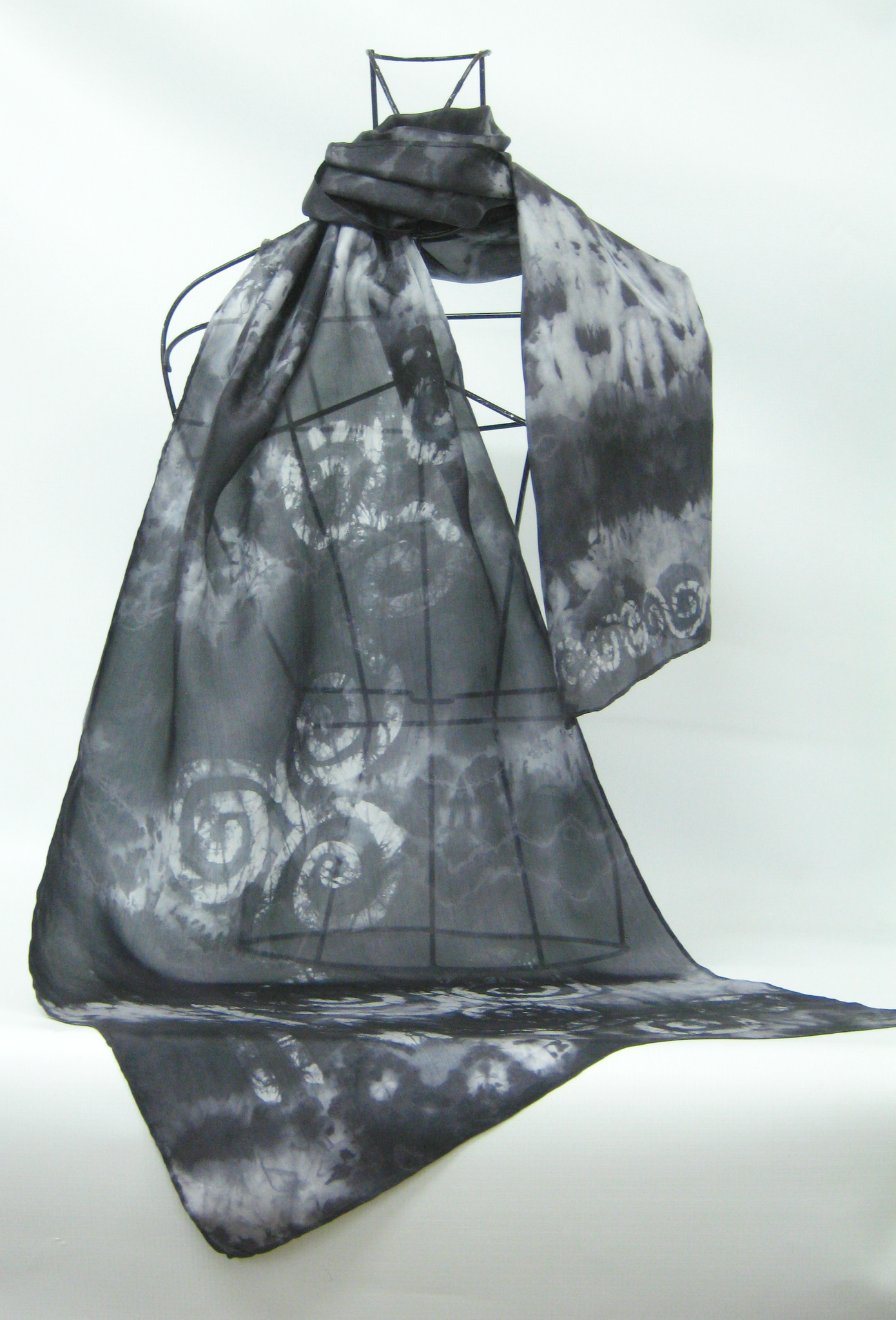 This scarf sutally captures the spiral shapes that appear through out with blended shades of grey, black and white.