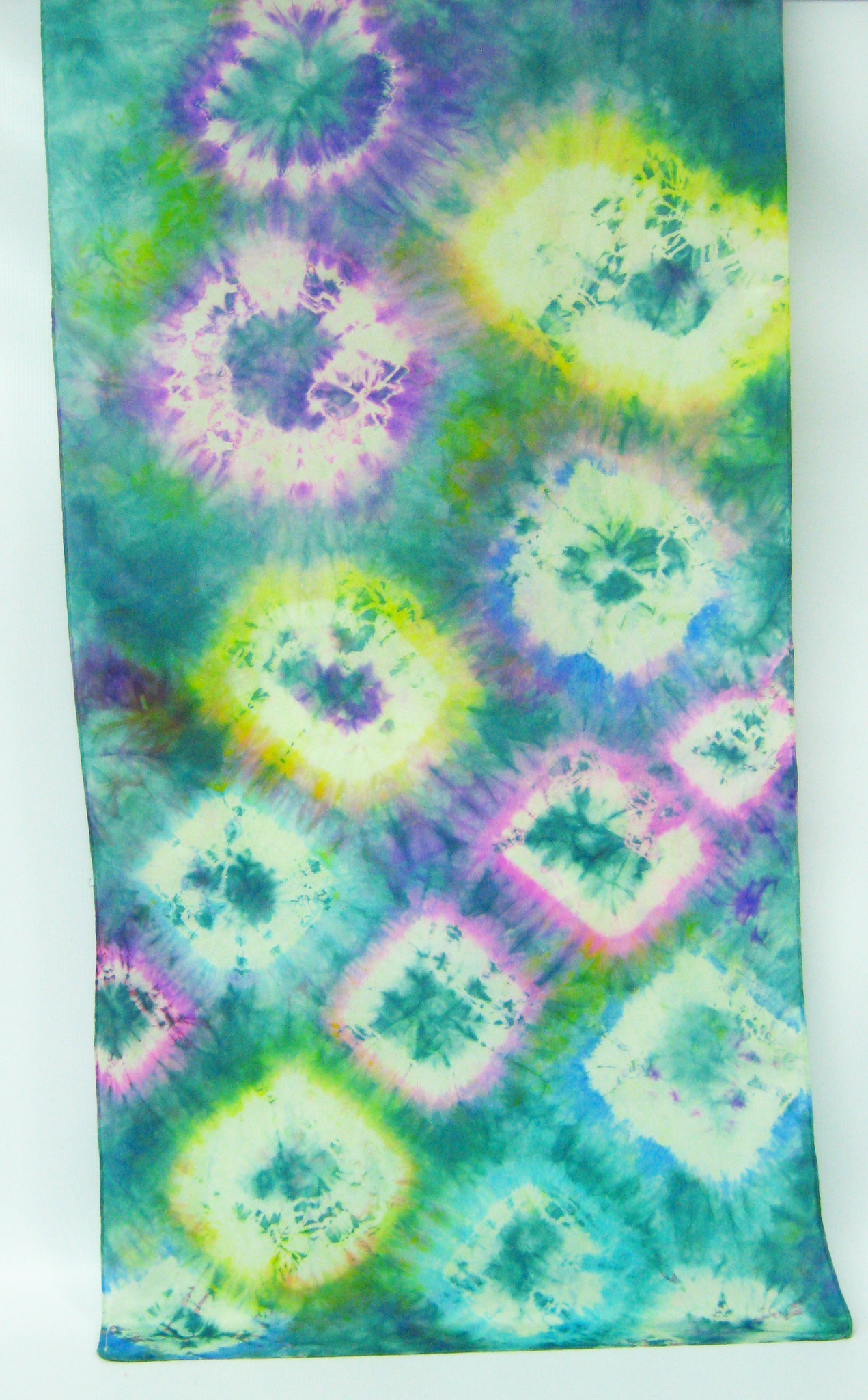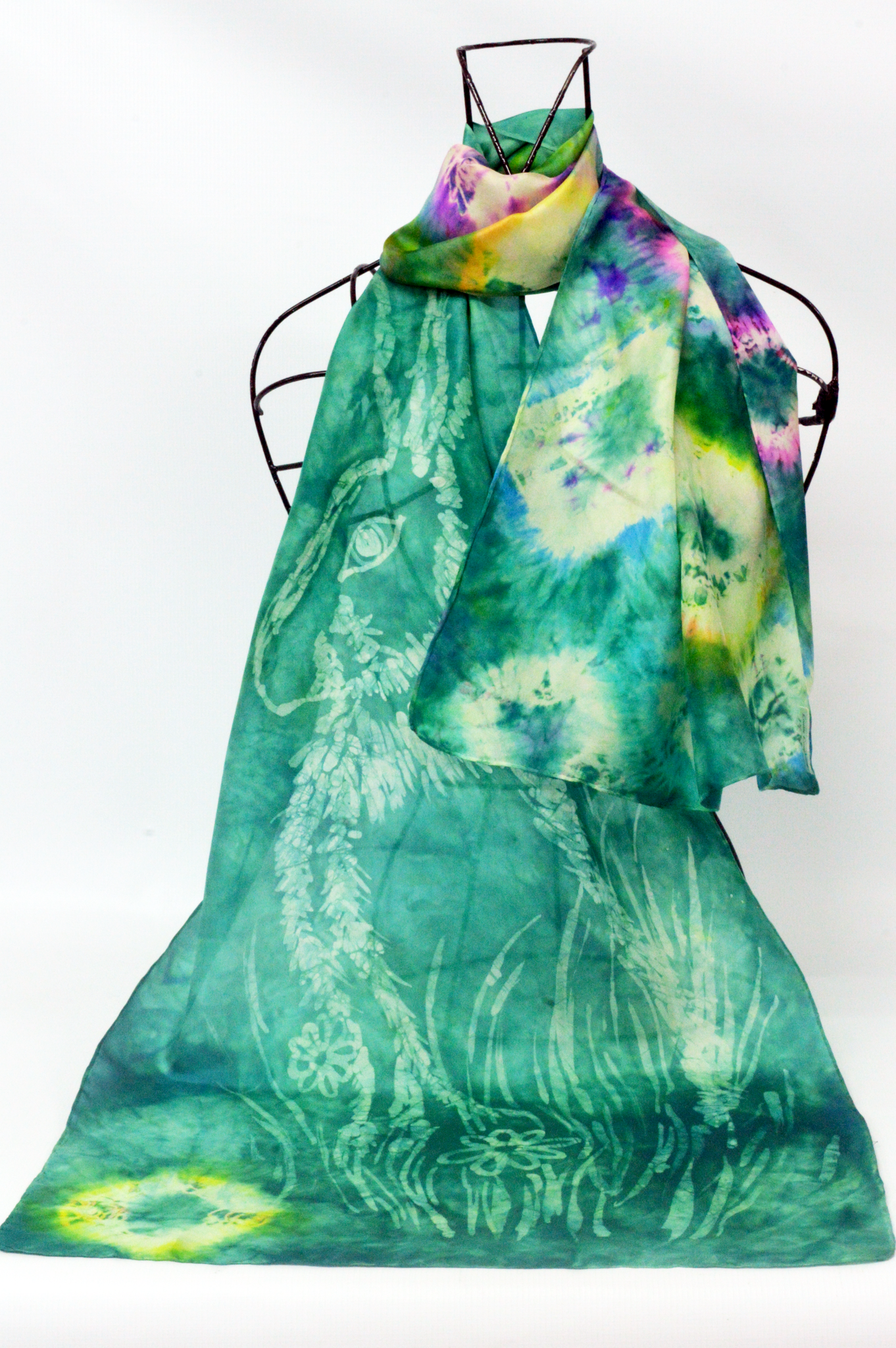 A hand painted silk scarf done in the art of batik in subtle shades of green with hints of purple, yellow and pink.