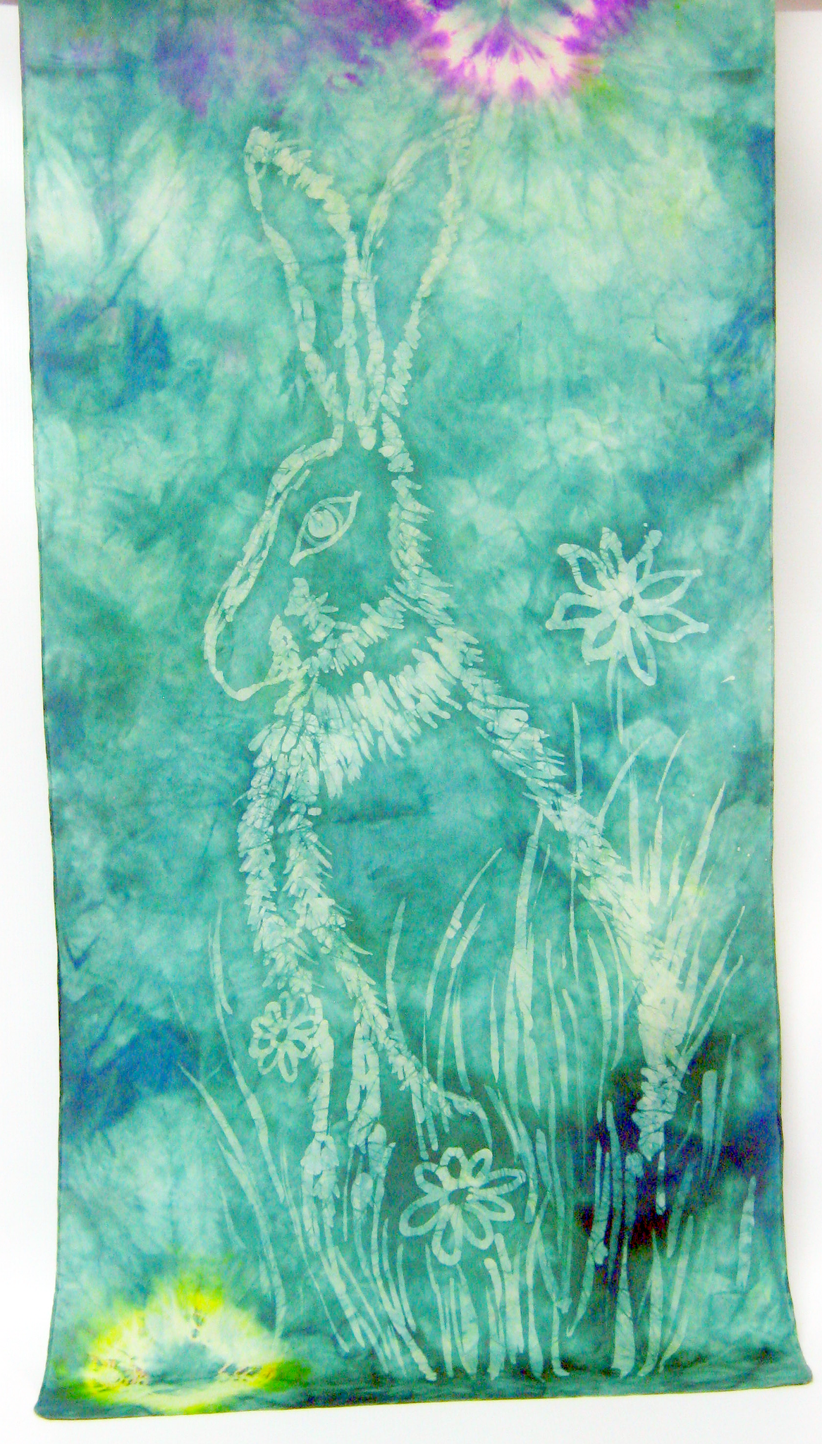 A hand painted wag drawing of Irelands brown Hare with a combination of tie dye and painting