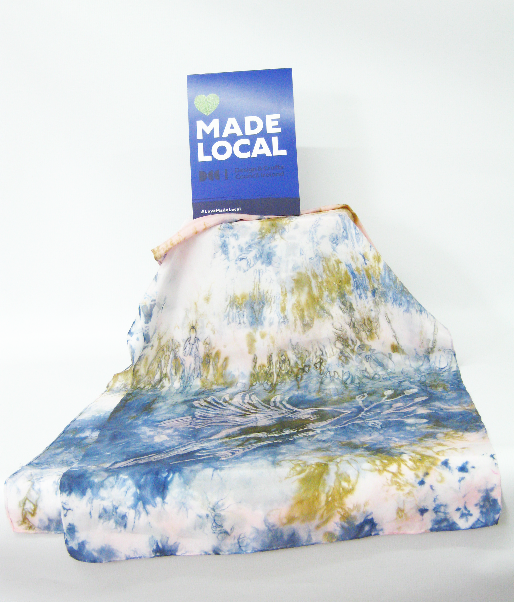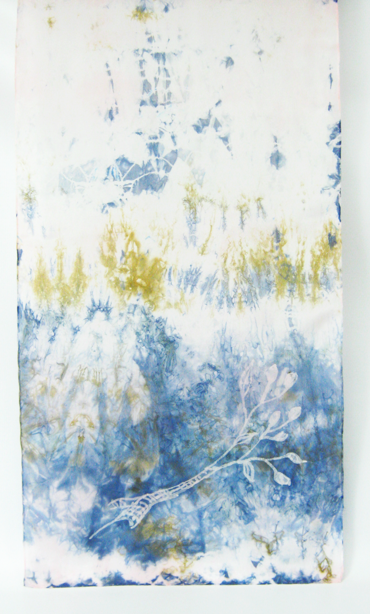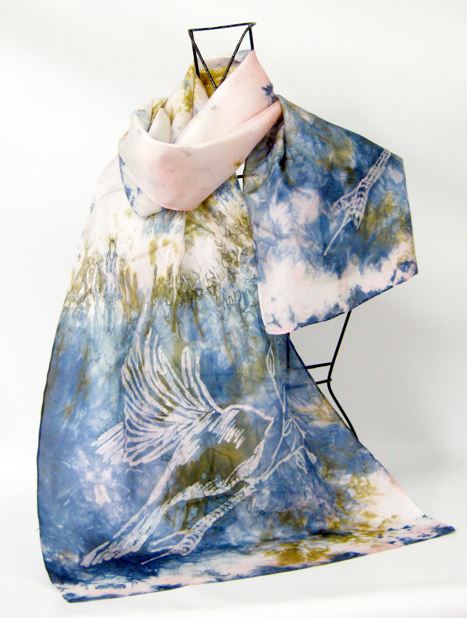 The line drawing of the bird is hand painted in wax by Louise it remains the natural colour of the silk