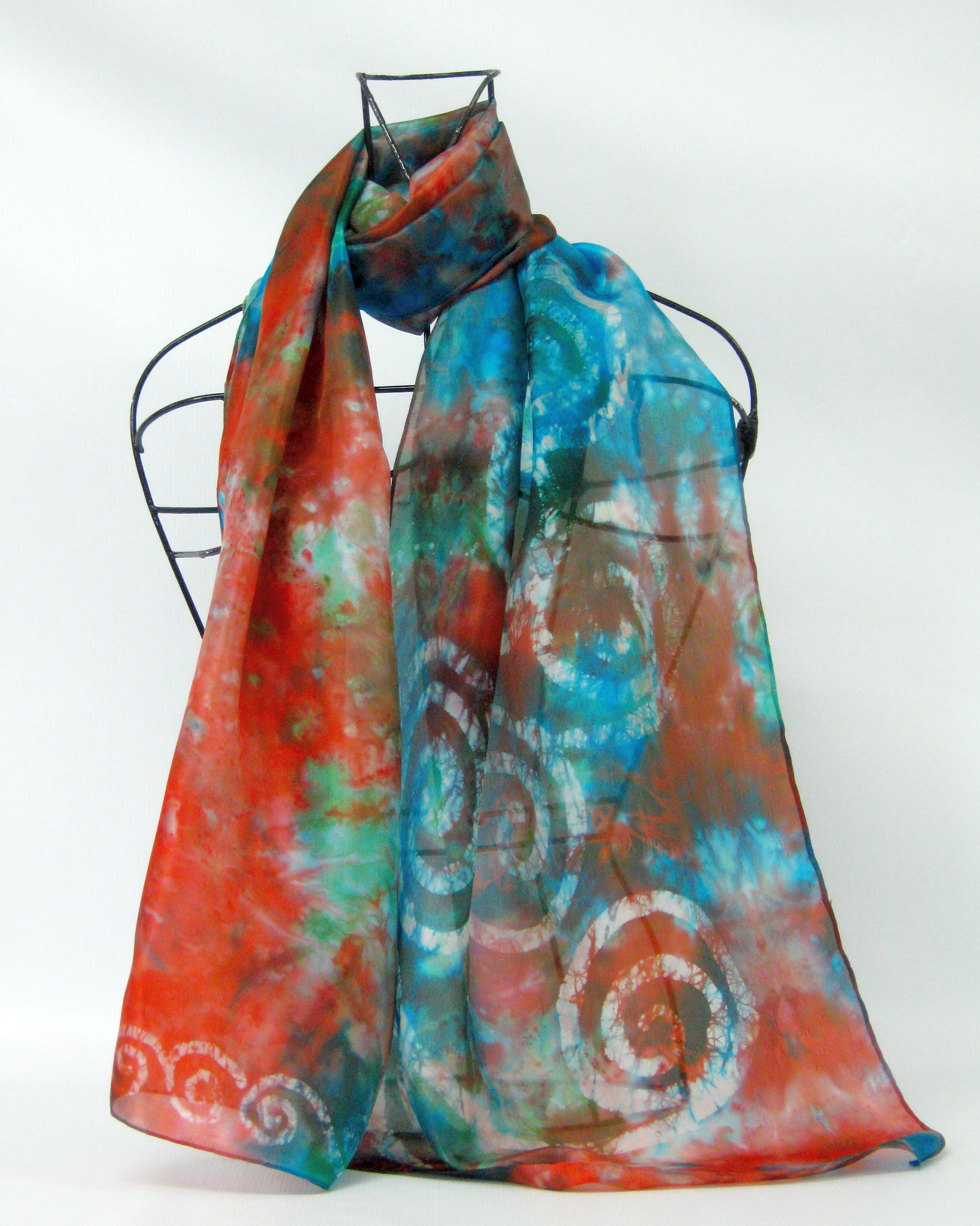 This light weight silk is so soft and silky and really lovely to wear in shades of turquoise teal and deep orange merging to create a rusty brown Autumn with a turquoise gem