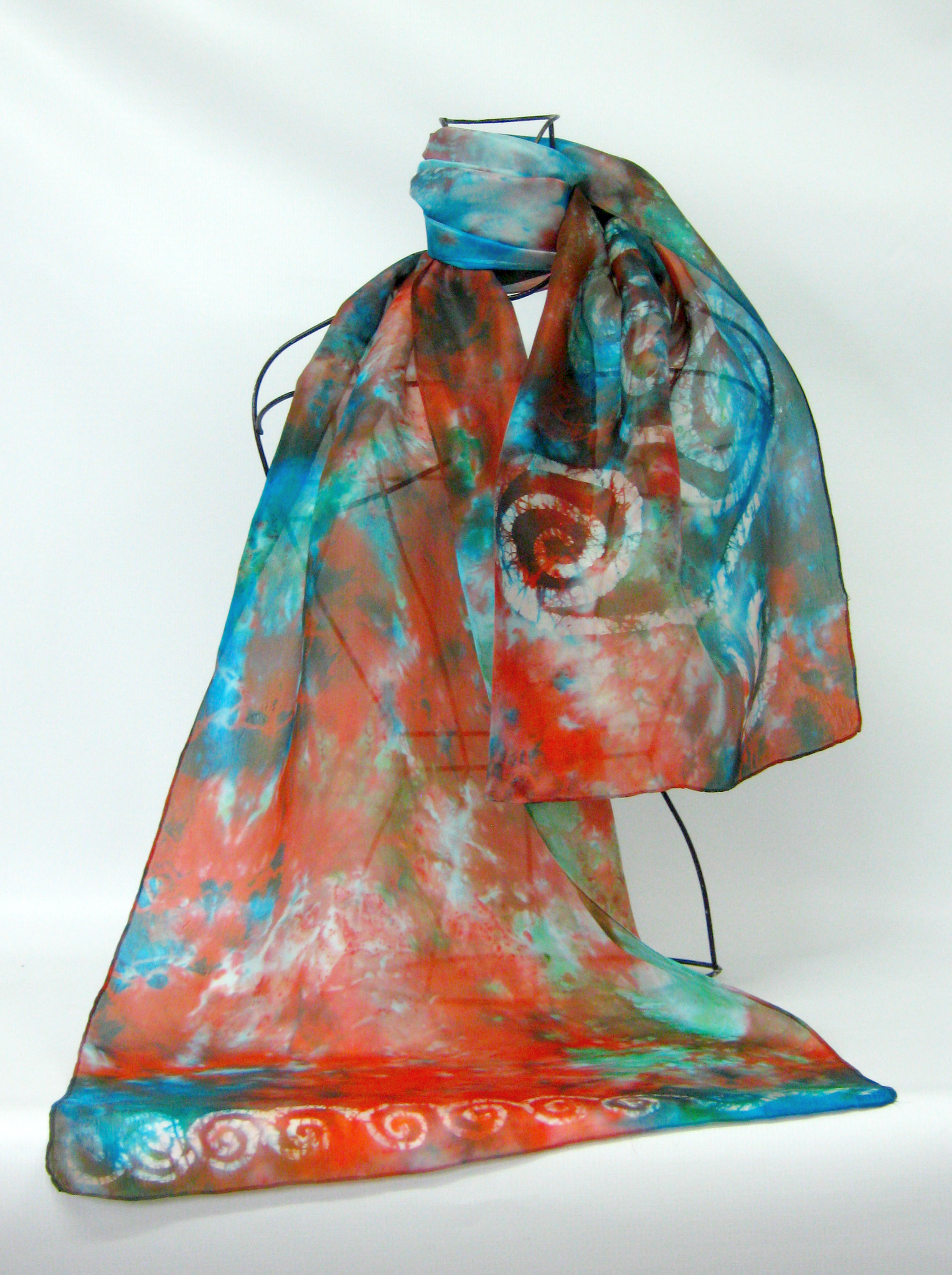 The design is a wax drawing of Celtic spirals inspired by Newgrange one of the oldest heritage sights in the world. The combination of hot wax on fine silk creates fine crackle lines that add to the texture of the design the nature of the technique makes each scarf a one off unique piece